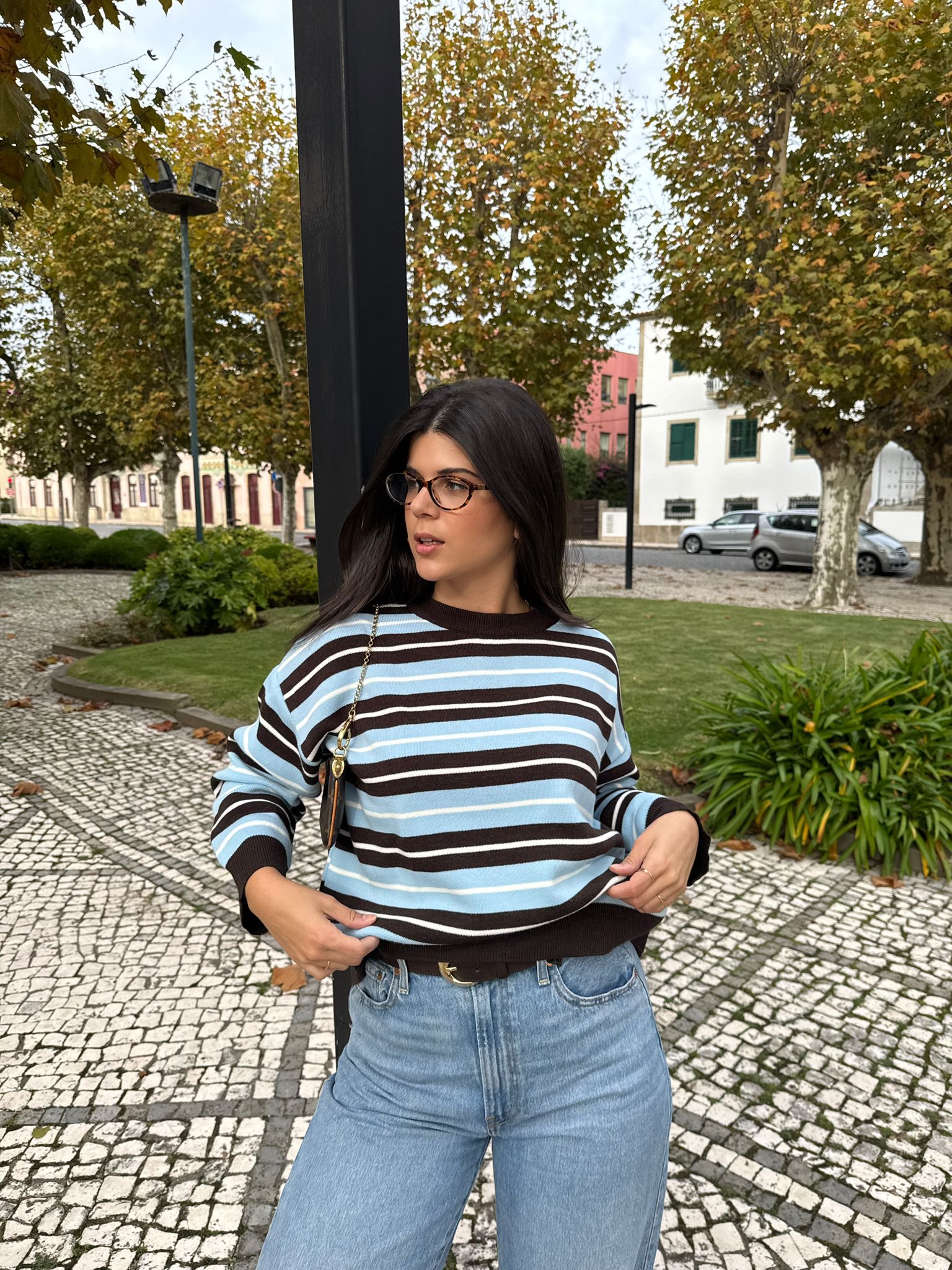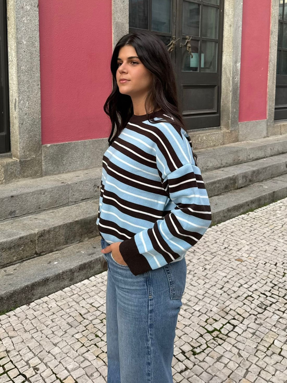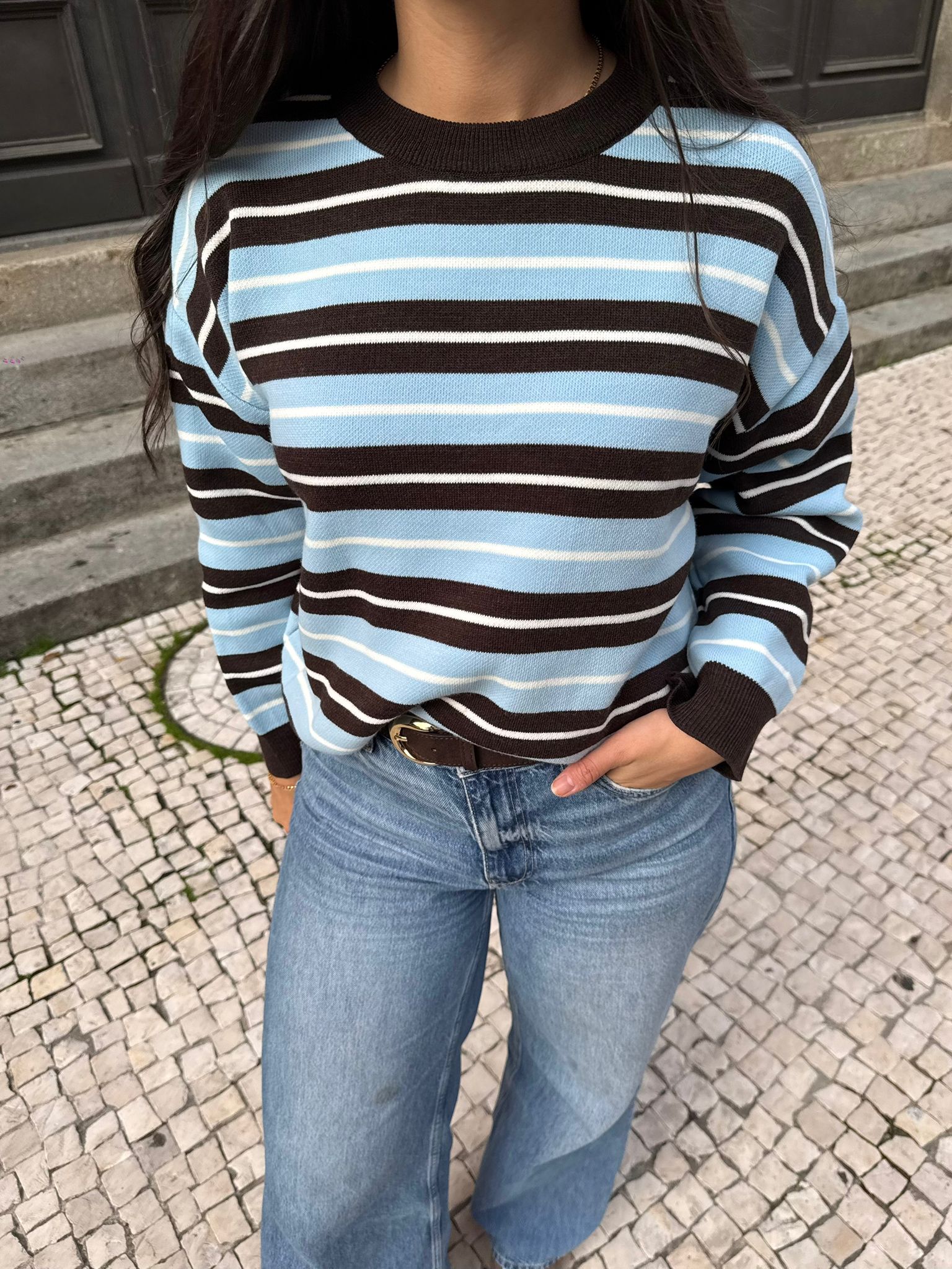 Camisola feminina com padrão de riscas em tons de azul profundo, castanho e branco, uma combinação moderna e sofisticada, perfeita para o outono/inverno 2025. Confeccionada em tecido macio e confortável, oferece um toque suave e um caimento impecável.